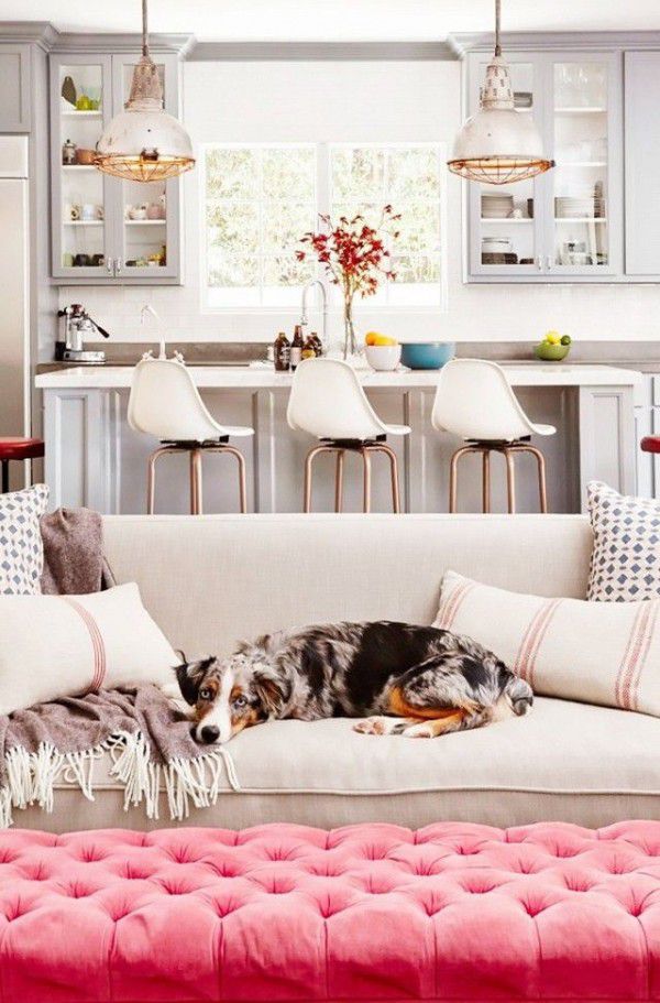 8. This design is perfect for a small house, where you connect kitchen and living room. Look at this bright pink. It soothes the difference between areas. The living room area uses pretty fresh patterns and color.