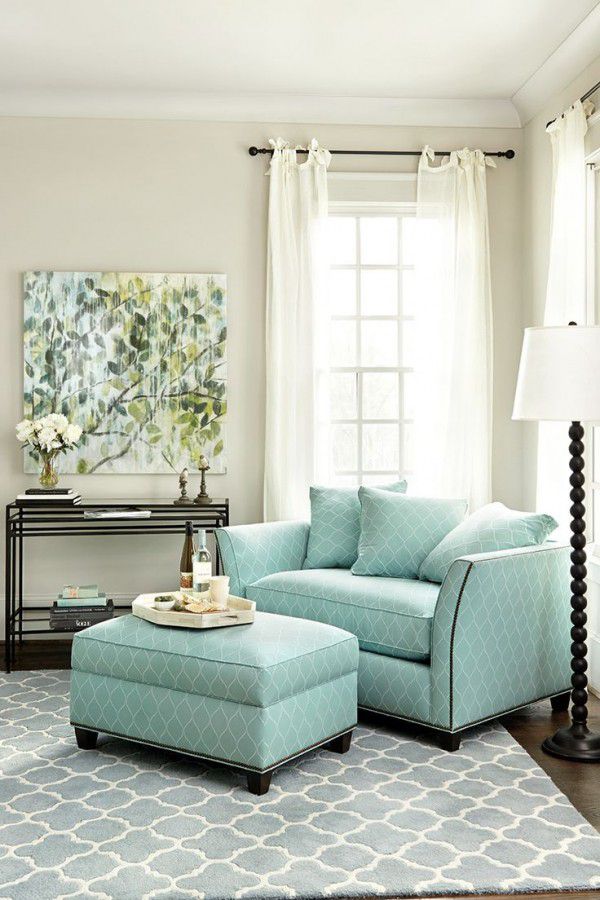 6. Light grey isn’t the only color that can be used for living room. The main color is soft blue (almost turquoise) here. In light white and dark wood surroundings it looks quite bright and unusual.