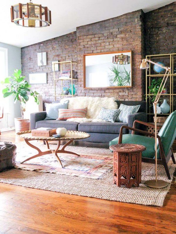 4. Brick walls are still trendy in home décor. They go well with metal and lighting accents. The romantic rural style prevails in this living room, and wonderful rugs warm it up.