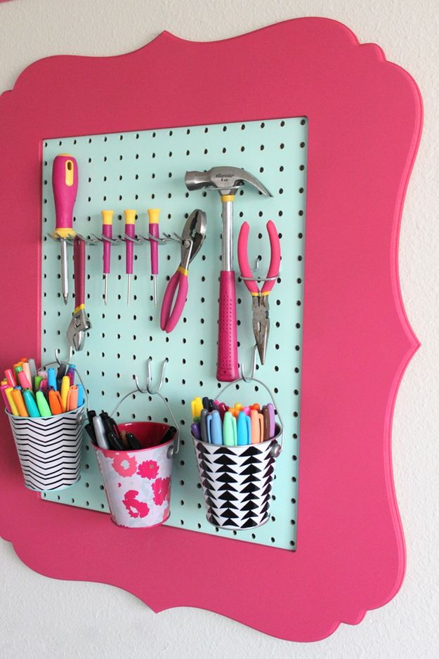 A little paint, pegboard, and chicken wire is all it takes to transform frames into craft storage. They are OK if you need not so big craft storage or just a board to hang on papers with ideas written down. It’s a nice idea for a place with empty walls that you’d like to cover with something beautiful. It’s also the best way to use unnecessary frames or transform your old boring photo gallery into a nice and useful craft organizer.