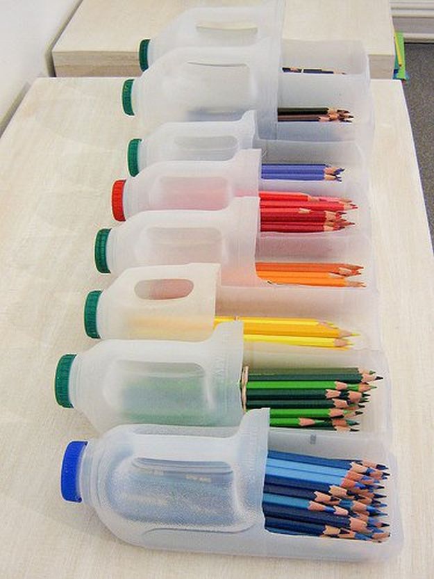 A nice idea to recycle old plastic bottles into pencil containers. Looks nice in contrast with multicolored pencils. Put it on or under the table in a craft room and be as creative as you can!