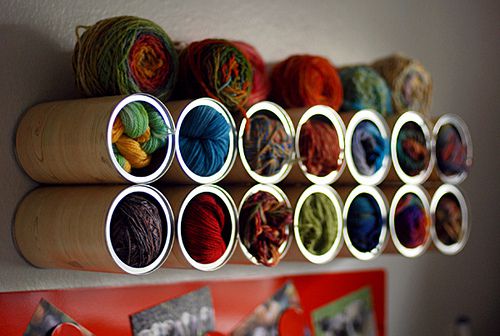 If you’re still saving your coffee cans for awhile, this is the time! This yarn organizer looks awesome and it’s very handy. You’ll need to wash cans, then cover them with a creative bright or pastel paper and fix them together with a strong glue or cement. This work needs attentiveness and accuracy, but let your dream of an amazing yarn organizer be your stimulus! By the way, looks perfect with multicolored yarn inside and around it.