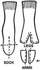 2) Now make the doll's body out of the bottom part of sock. Then you need to fill it with cotton wool and sew up neatly. Now the doll has legs and arms.