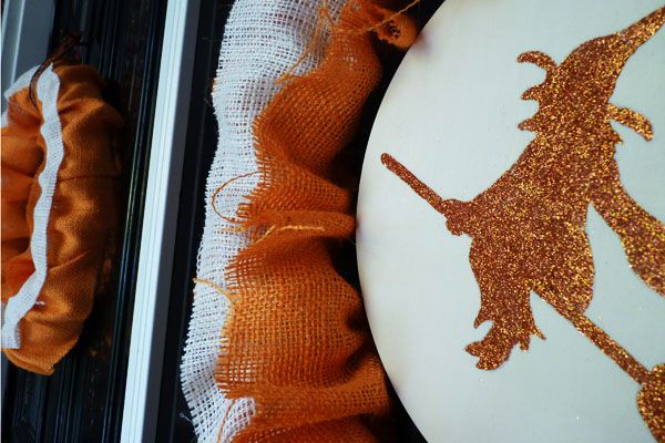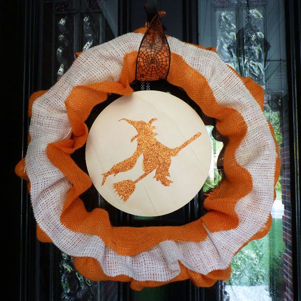 Okay, it’s very simple. You’ll need burlap of 2 colors, big wreath form, wooden circles, printable sketch of a witch, gold glitter, black ribbon, threads, glue, scissors.