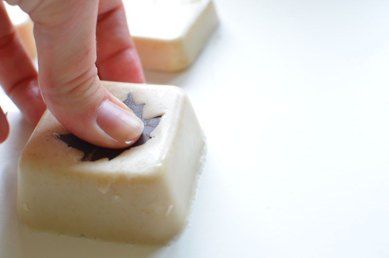 To add the leaf print, easily give the metal leaf shape a good push into the top of a soap cube. Be aware! If the soap is not solid enough, you can stamp too hard and everything would pop onto you. Generally, working with homemade soap is quite easy; I’m not trying to scare you! XD