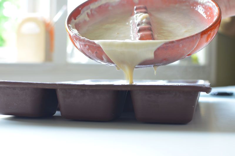 Once you finish, carefully pour the melted soap into the molds. Let soap stay still until it is almost completely hardened. “Almost” is an important word here! This step is the hardest part of this tutorial because you must wait until the soap is tough enough to get it out of the pan; at the same time it’s soft enough to add the leaf detail.