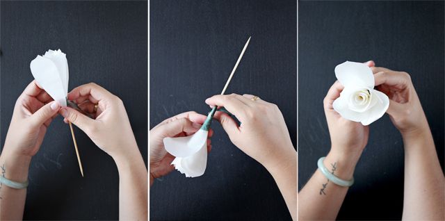 Take one more petal and make sure the points don't line up with the first one. Wrap around skewer and secure with floral tape. Always try and keep petals at about the same height.