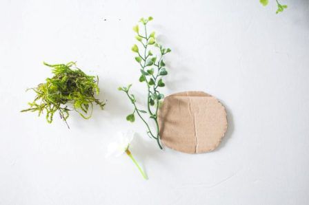 Cut out a piece of cardboard that would fit inside the jar. This will be the basis. Moss and artificial plants glue to it with the help of glue-gun.