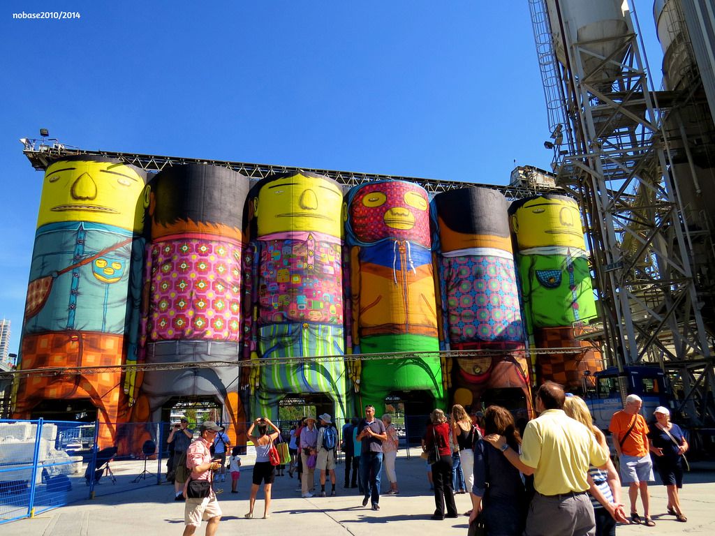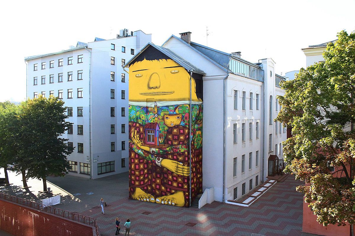 Gustavo and Otavio Pandolfo started painting graffiti in São Paulo as teenagers, working on city streets for over ten years. Today they have held numerous solo and group shows in museums and galleries in several countries such as Cuba, Chile, the United States of America, Italy, Spain, England, Germany, Lithuania and Japan. On huge wooden panels, lanky yellow figures dressed in peacock patterns and paisley strut and breakdance… To understand the work of Os Gêmeos , it is necessary to allow mind to be replaced by the imagination. You should feel first and understand later.