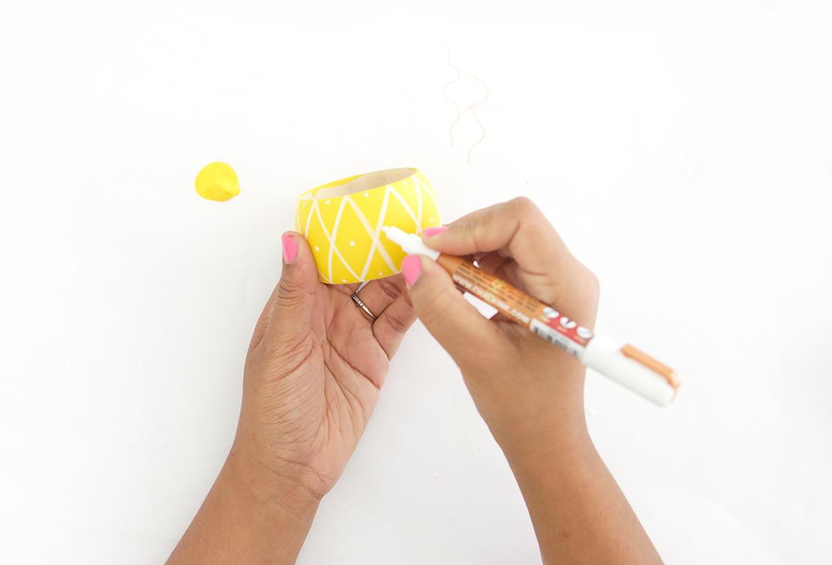 The next step is to paint the bracelet with yellow paint and draw rhomb-shaped patterns on its outer surface using a white marker.
