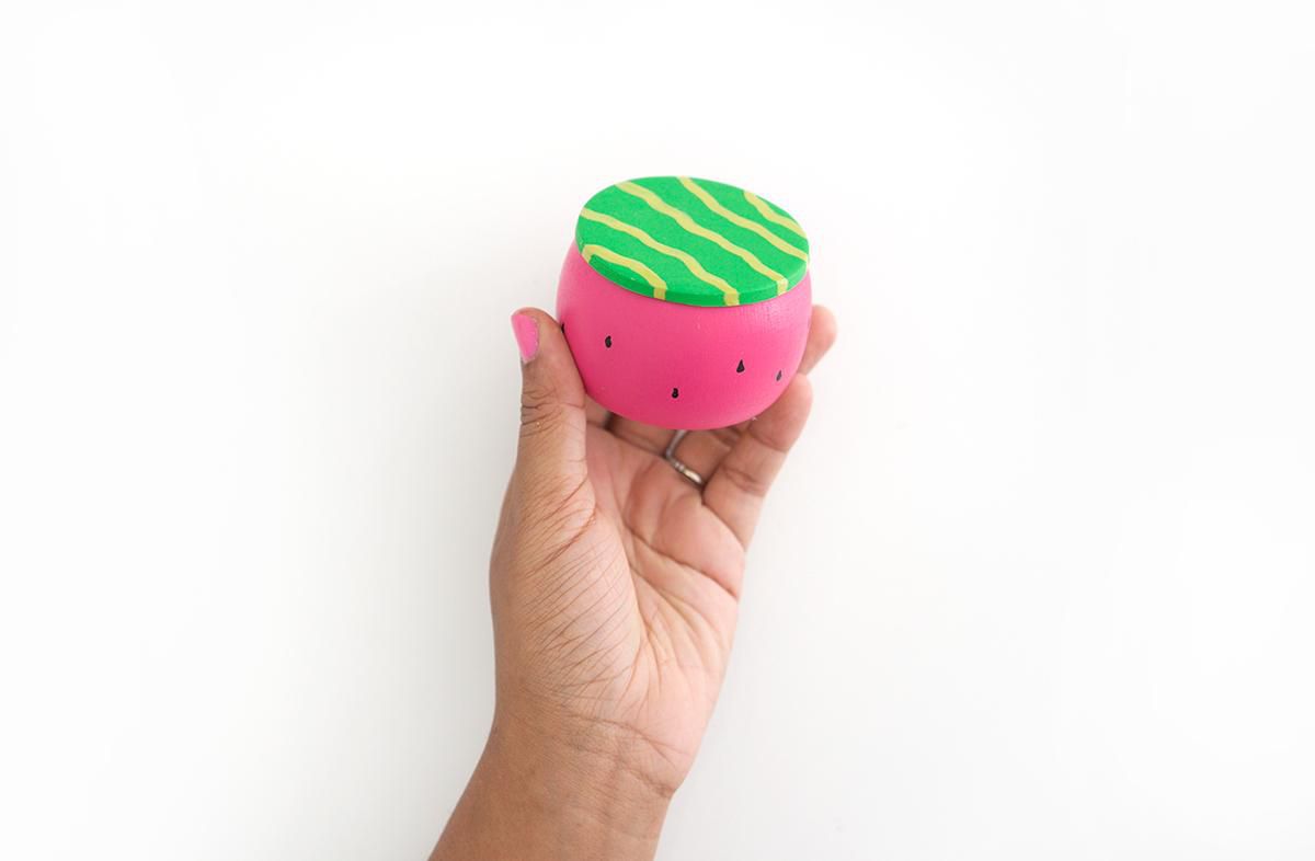 Paint one more bracelet, but with pink paint and draw black dots-seeds on its surface. Make a lid out of green polymer clay and paint wavy parallel lines on top of it, as on the watermelon rind.