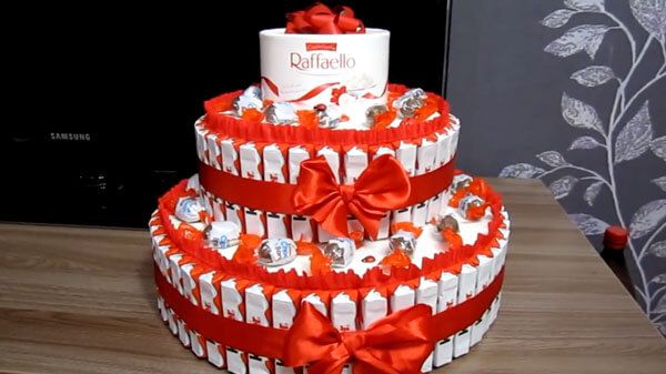 As a final step, you need to put the box of «Raffaello» on top of the cake. Done! Please your friends and family with such creative little sweet presents!