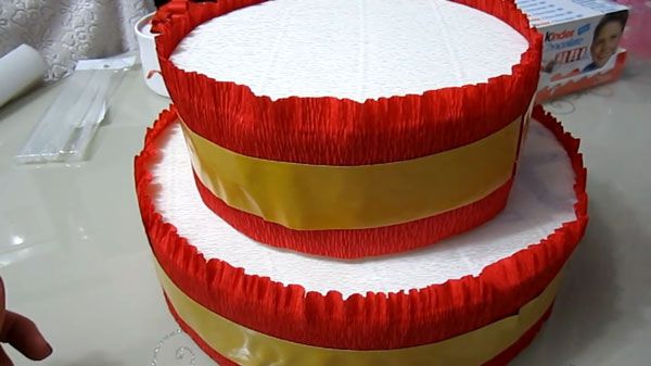 Wrap both bases using crepe paper and fixing them in several places. Now let’s start working with chocolates - you need to apply some glue on their back side and stick the chocolates to the base of the cake. The same way, cover the whole area of the base. Then, decorate the chocolates with the help of satin ribbons.