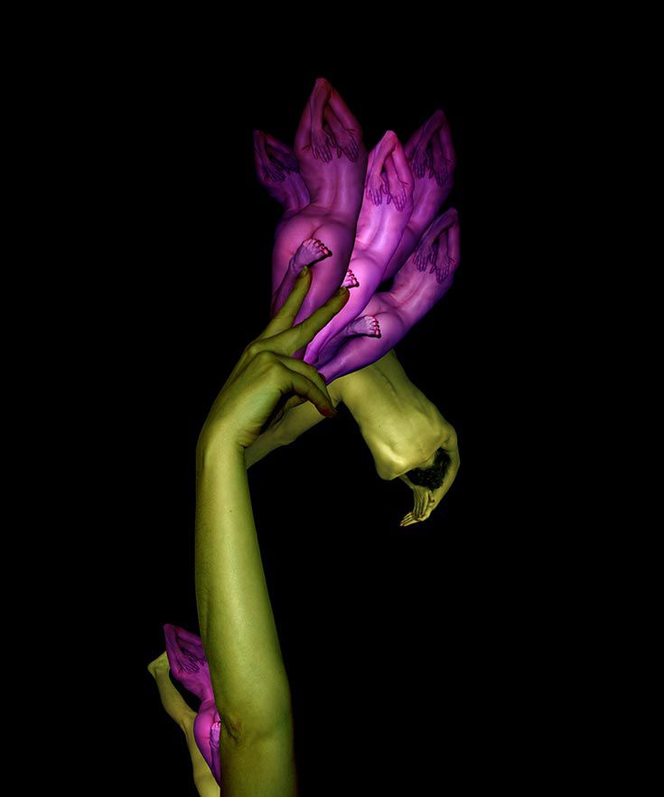 Cecelia Webber uses human bodies to create her digital photographic images, specifically naked human bodies painted strategically to create repetitive patterns that reflect a plant or creature for one of her many masterpieces.