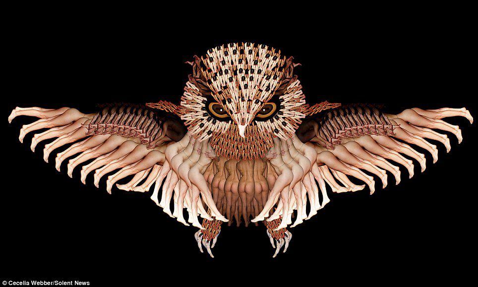 Cecelia Webber takes photos of nude models and spends up to a year editing them together on her computer to create extraordinary collages. After photographing a series of models in various poses, she digitally cuts, rotates and colours their bodies and limbs to create a finished image.