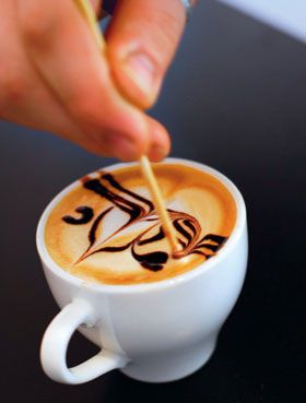 Fill the confectionary syringe with melted chocolate, and you can begin to paint in a mug of coffee, on the foam.