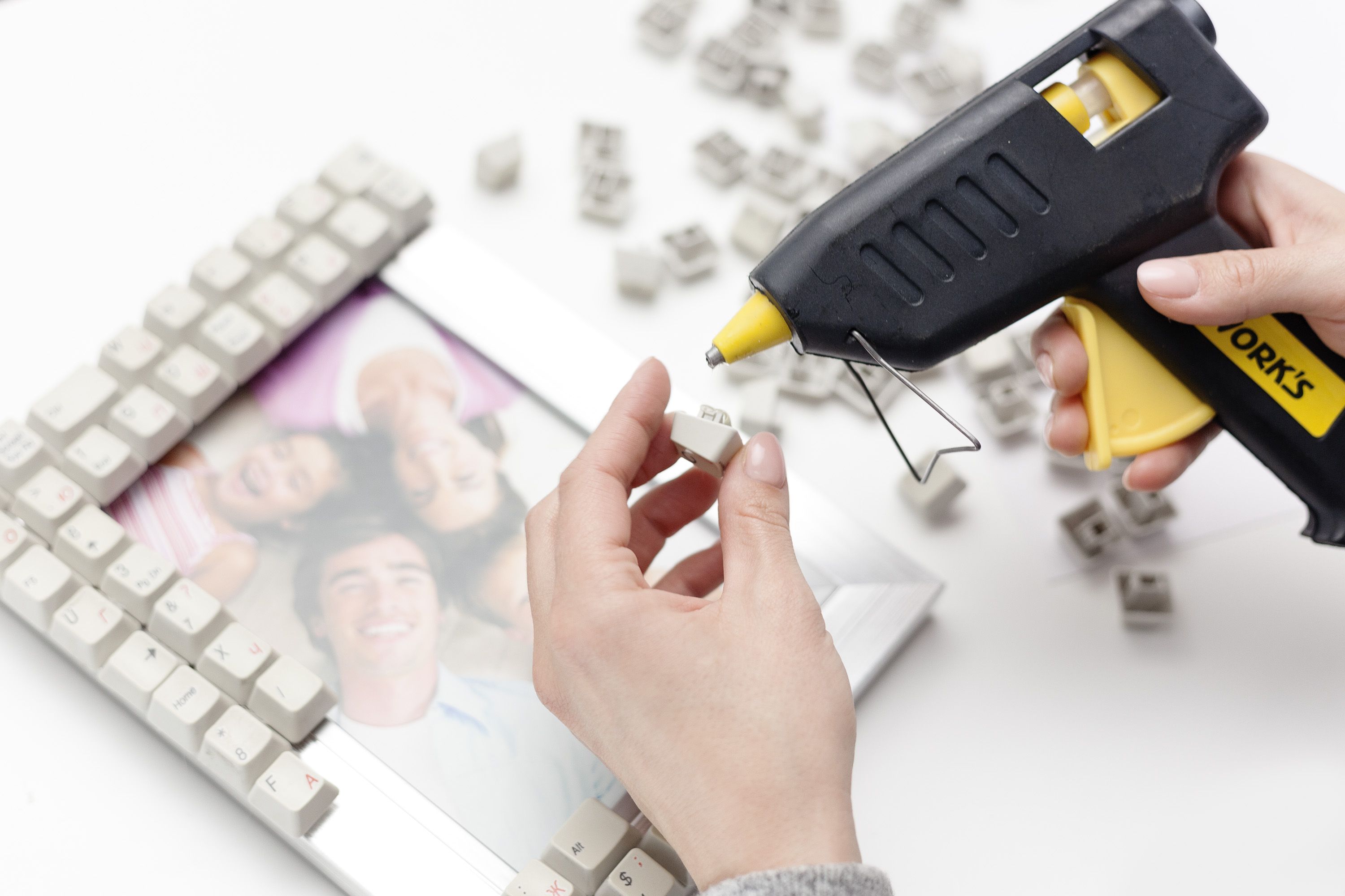 Frame with keys from an old keyboard has an absolutely amazing look! Just pull them off using scissors and glue in random order to your frame.