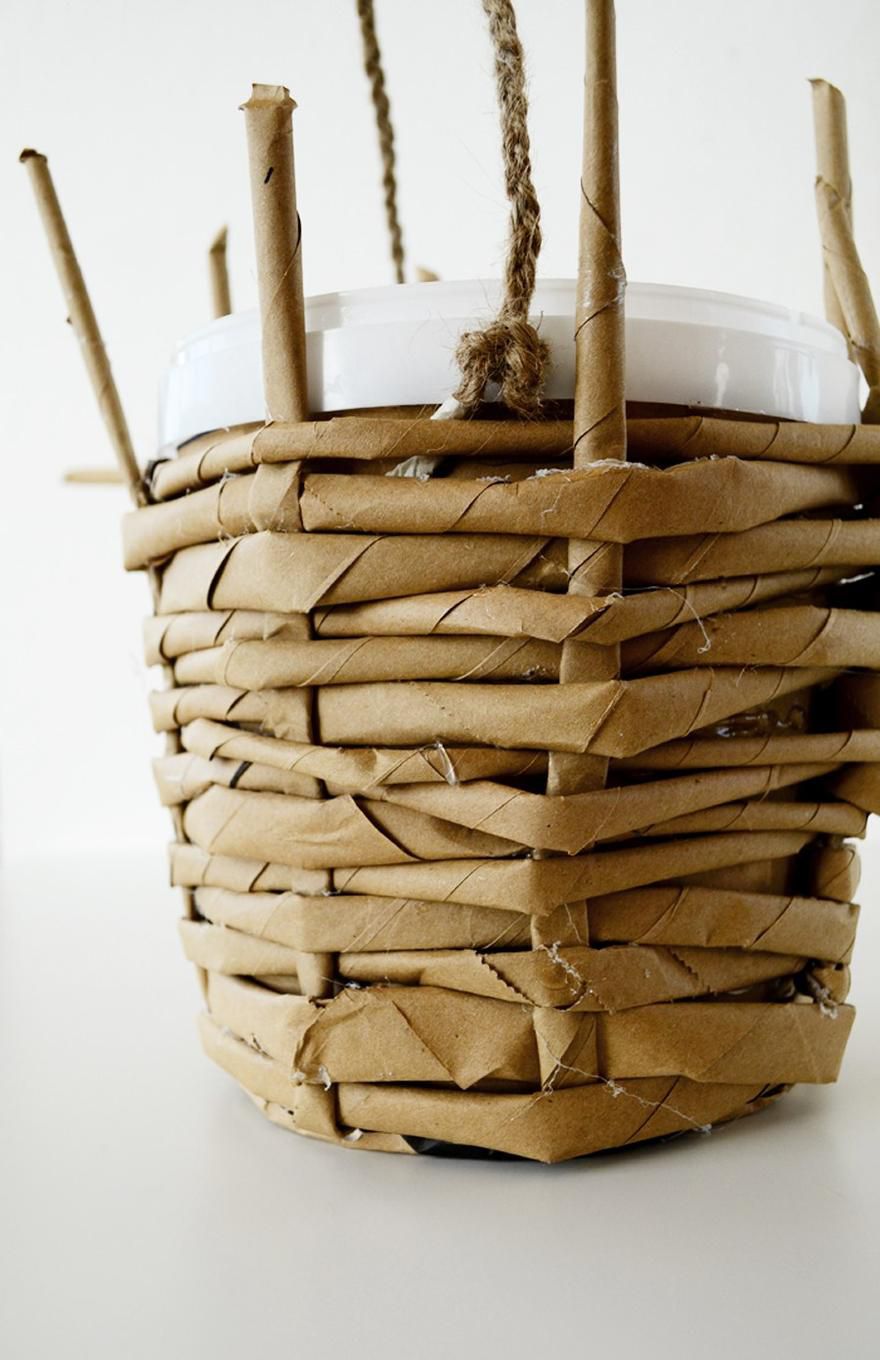 Then cut stripes 7 × 45 cm and also twist into tubes. Press the first ones to the the sides of the container, and wrap the long one around it, criss-crossing the fitst tubes.