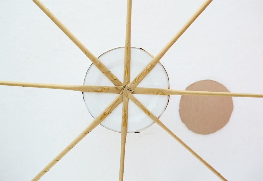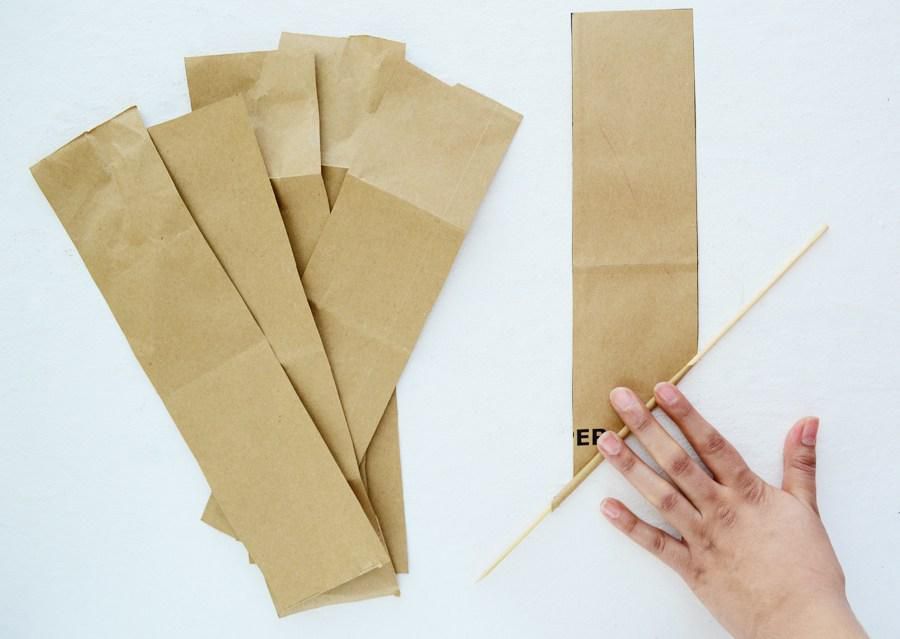 Draw lines on one of the paper bags and cut it into 8 stripes 7 × 30 cm. Then, put the wooden skewer to the corner of a stripe and roll it diagonally, so that in result you get a paper tube.