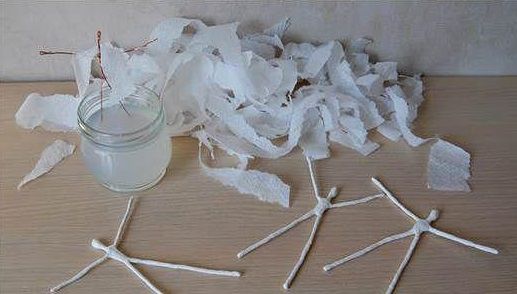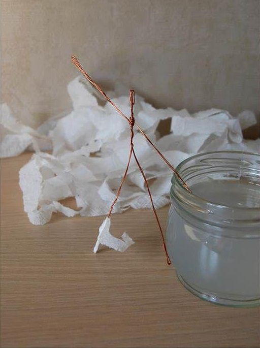 Step 2. Begin winding napkins on the wire, previously allowed into small pieces. Do it carefully. Use water in order to wet the napkins and they are held tight on the wire.