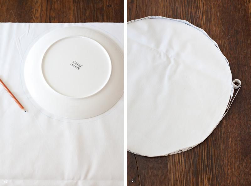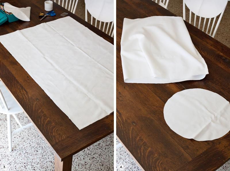 Lay the cloth side up on the table. Outlibe a large plate or a lid, drawing a circle on the fabric.