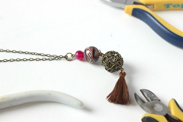 Make a beaded pendant. You can also use aeneous rings, if needed. Fix a tassel below.