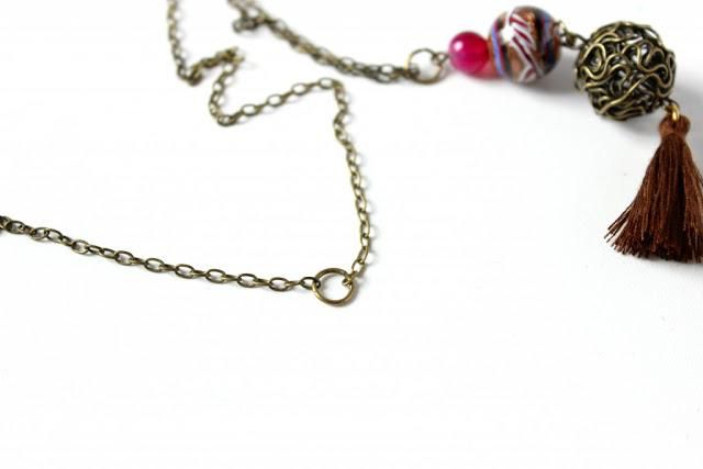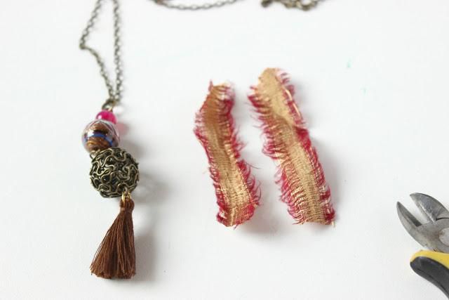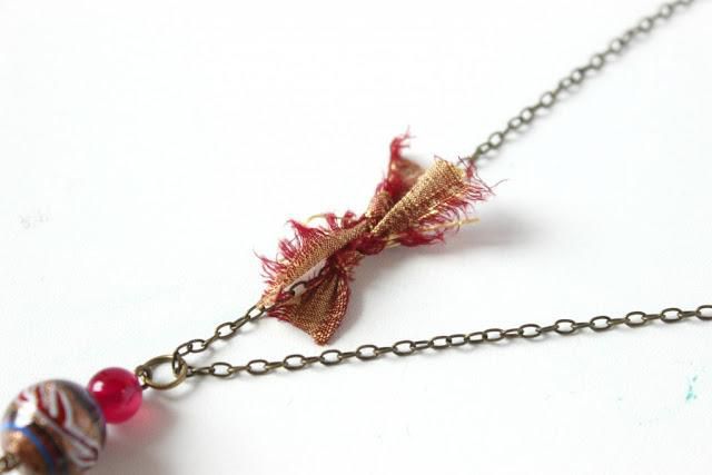 Beautiful handmade jewelry is ready, but you can make it look more in the boho style. Take a ribbon with the loose ends and tie it to the chain, so that you get something like a bow.