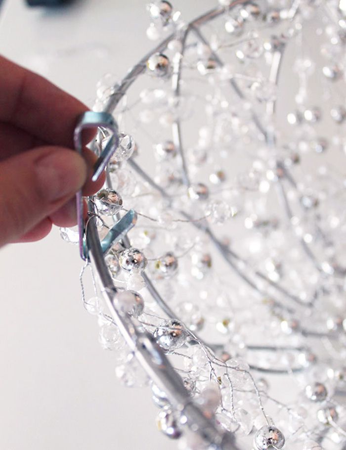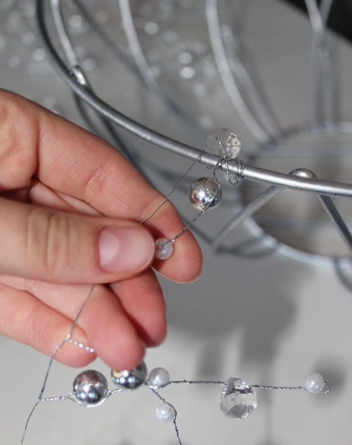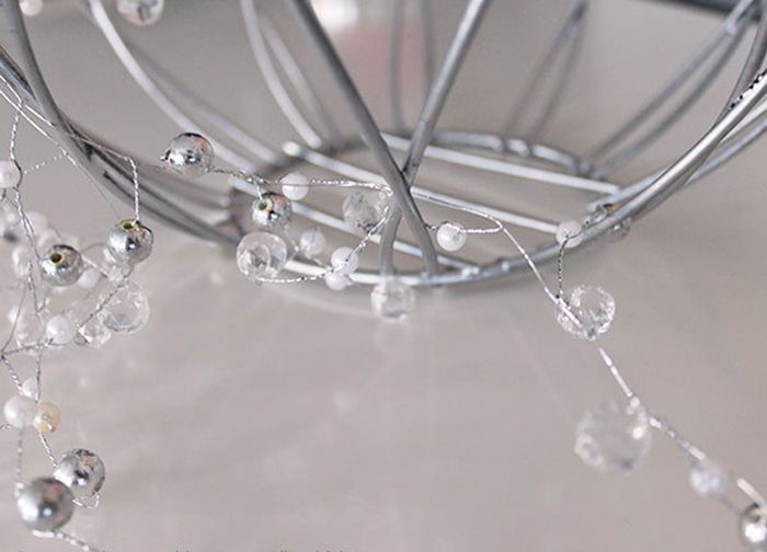 2. Using the same garland start winding its frame, moving above and below the bars. If your garland is made from a good wire, it is inevitable that it will be twisted and entangled. Let the beads form in small groups. You need to fill the gaps and voids between the bars in the basket.