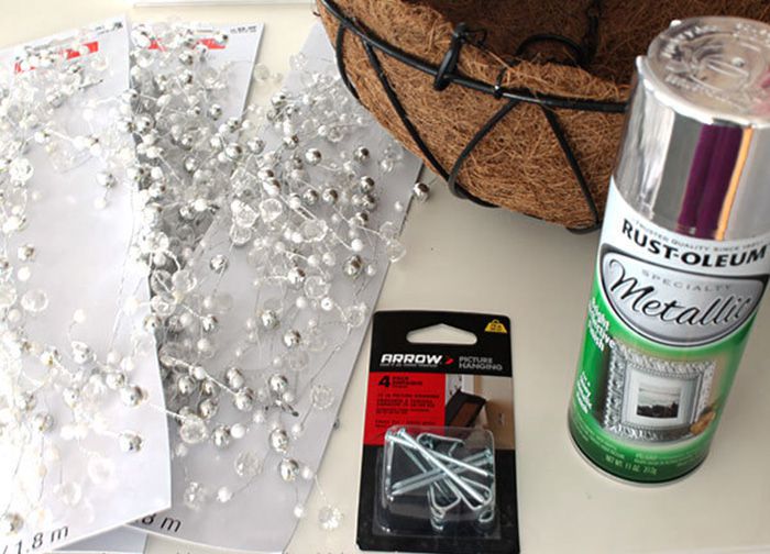 1. On the basket leave only the metal frame and then color it with spray. While the paint dries, put a garlands, straighten them and prepare for work. Once the paint is dry, take one of the chains garlands and wrap one end around the upper (wider) side. You can bend the festoon easily in any direction.