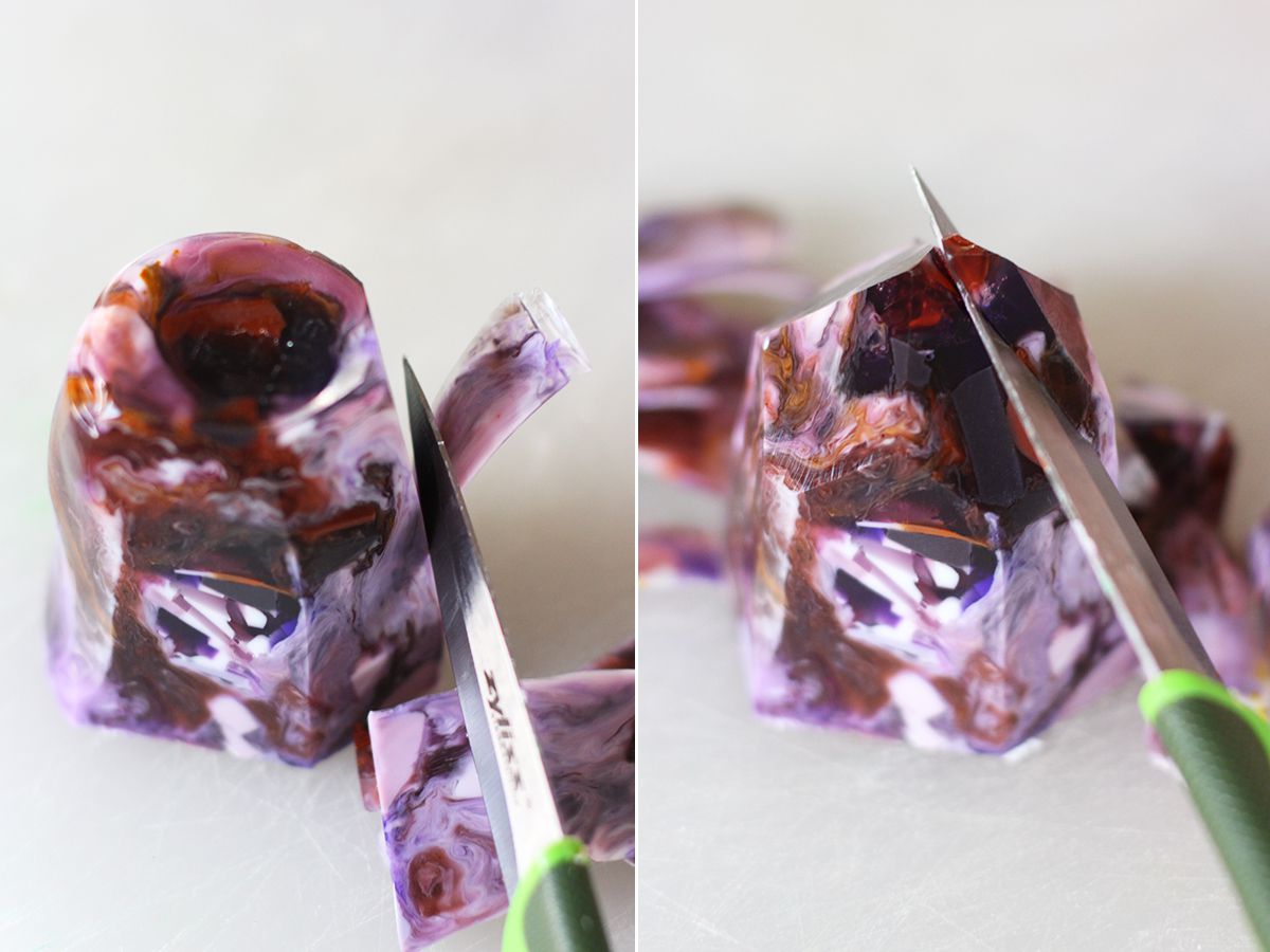 At this point, you can even pop the entire cup into the microwave for 5 seconds – just so the colors melt together more naturally. Or you can leave it as it is. The cup might warp from the hot soap – it’s okay. Just keep an eye on it if you do decide to put it in the microwave – you don’t want to melt a hole in your mold! Allow to set for a couple of hours – you can even pop it in the refrigerator if you, like me, don’t have the patience to wait. Once the soap has totally cooled and hardened, carefully cut the mold open with a pair of scissors.