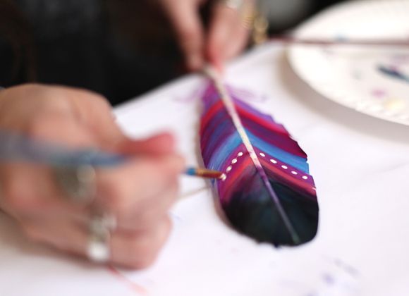 I’ve always loved the idea of painted fake feathers, and with festival season underway it seemed like the perfect time to do it. I originally imagined these as decorations, but then it was clear to me that they’d be a great detail for a festival outfit. This is a great thing to do outside on a warm September day, and once you start you’ll find it pretty addicting!