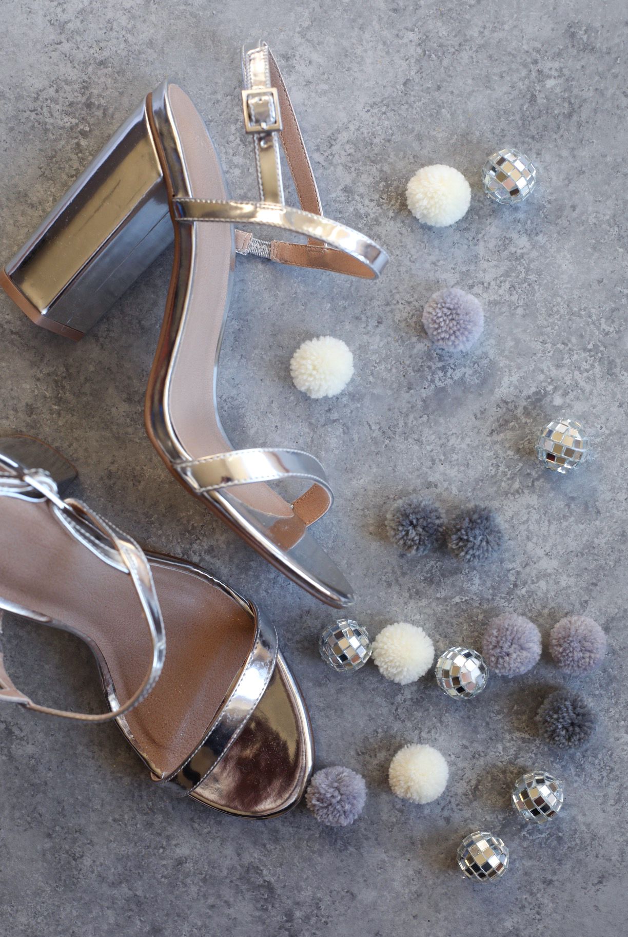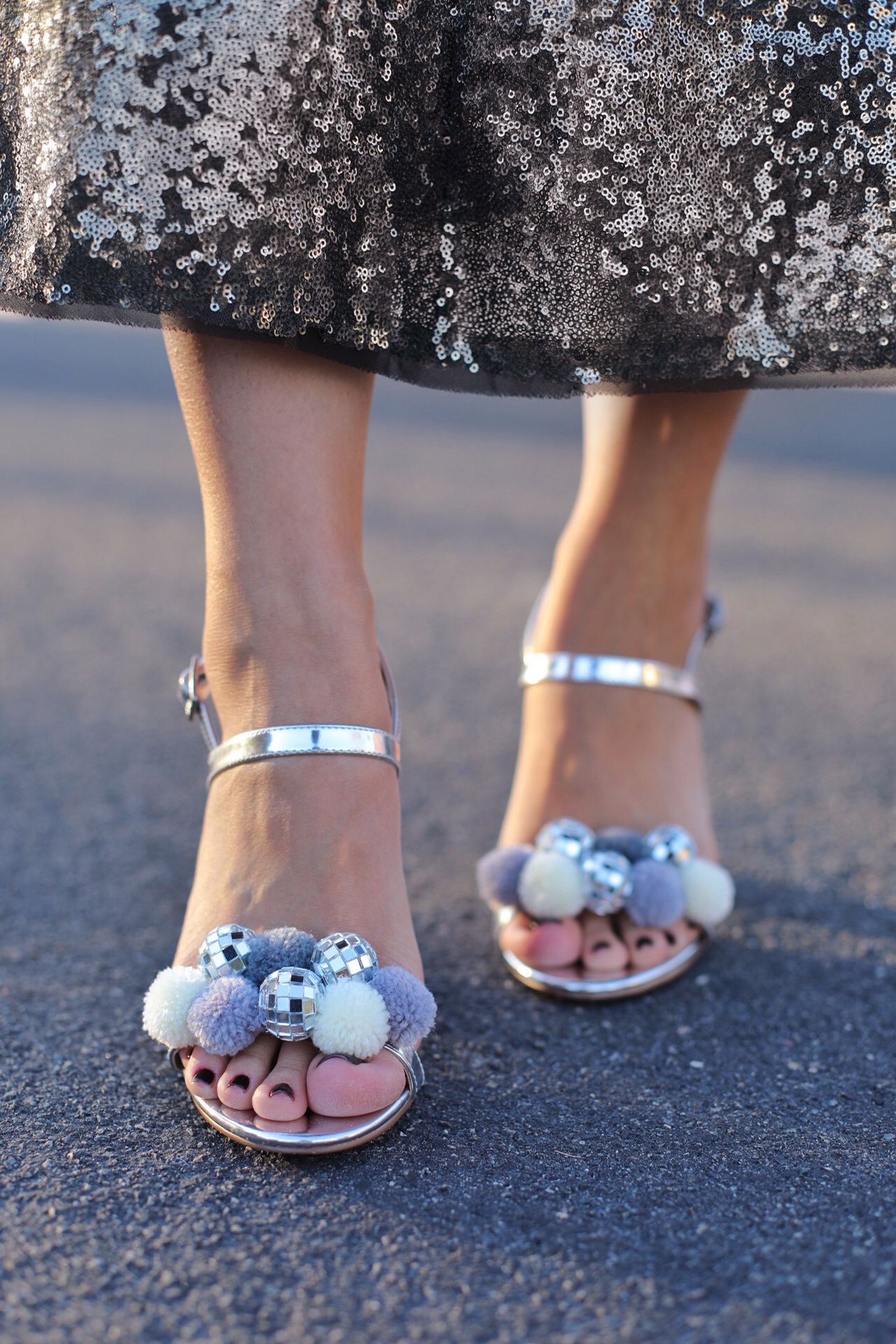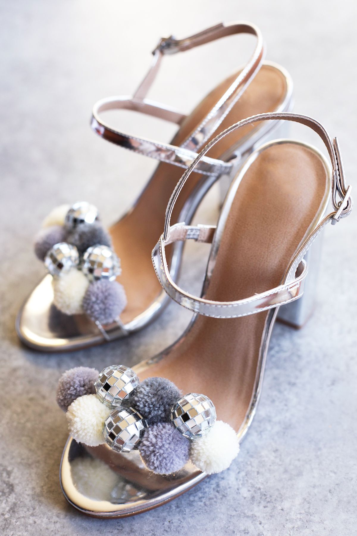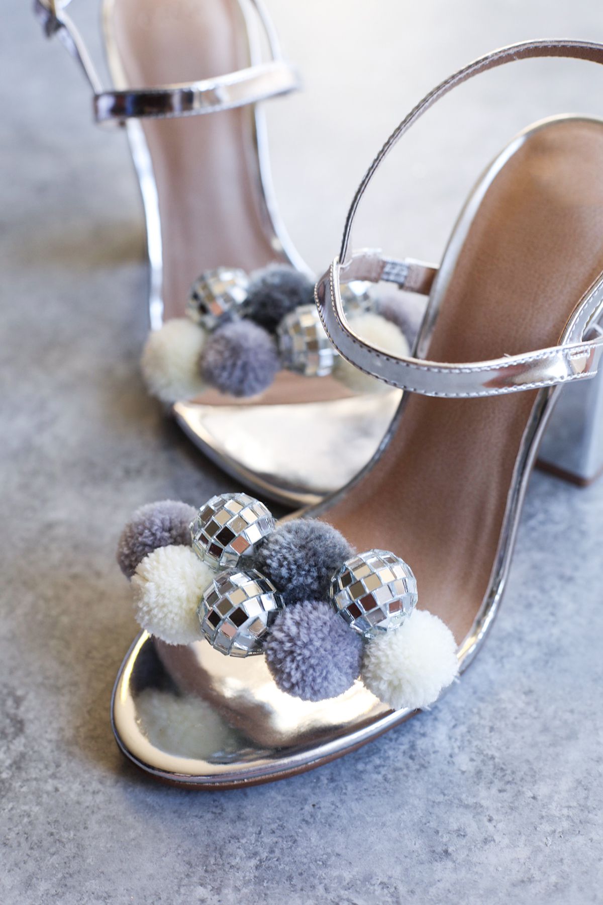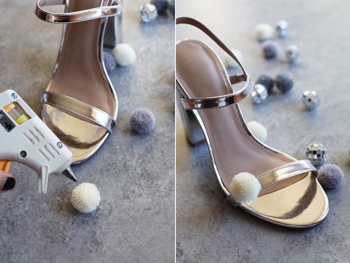 Prepare a hot glue gun. Put a decent amount of glue on the first pom pom and stick it onto the heel. Gently press it and hold while its gluing. Be patient. TIP: Put a glue on the side as well, this way pom poms and disco balls will stick together and it will be more secure.