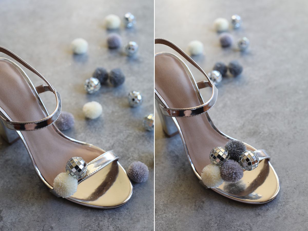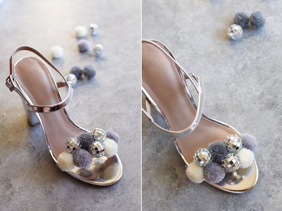 Remove the strings from the disco ball ornaments. Take a previous look on how you would like to place your pom poms and disco balls on the sandals so you won’t have a problem placing them later. It is important to make them look like they are fresh out the box and nobody will know that you spend only half an hour creating them :)