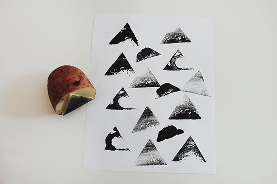 Cut the potato in halves and carve your stamp. In this tutorial we are making the triangle stamp but you can always change it. Try to carve it as smooth and even as possible. If you failed with a first half don’t worry and try on the second one.