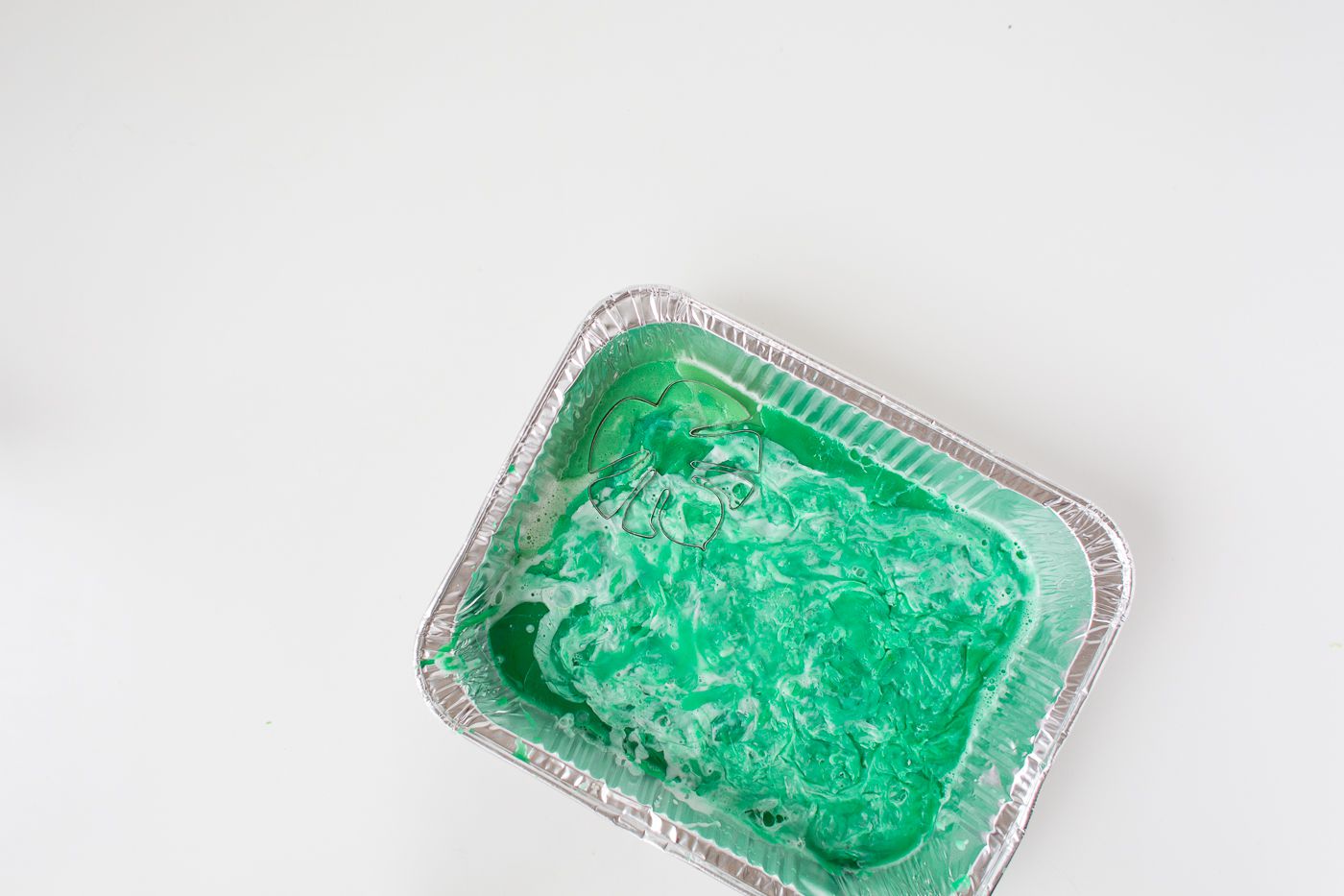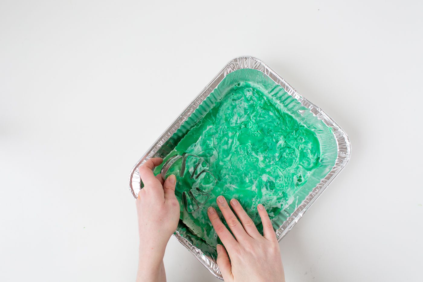 Pour some of the light coloring and keep mixing the soap. Eventually, the soap will become uneven. You can simply cut off the protruding pieces or just leave it uneven – as you prefer. Make sure that the level of the melted soap is as high as the cookie cutter.