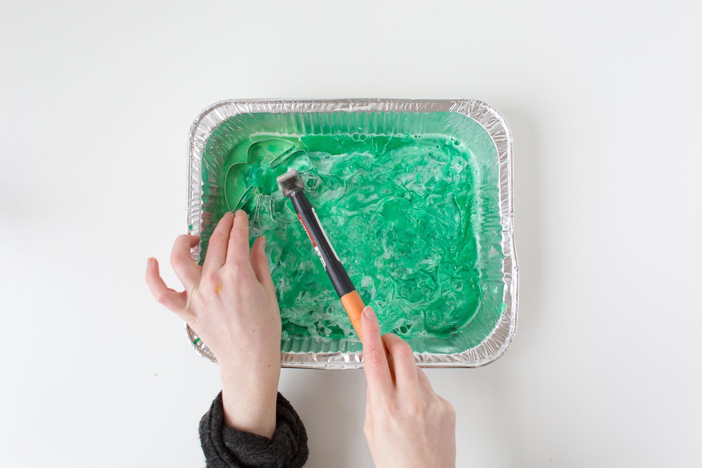 When the soap cooled take the hammer and the cookie cutter. Gently tap on the cutters using the hammer to help its go inside the soap. Then carefully take out the cutter with the soap.