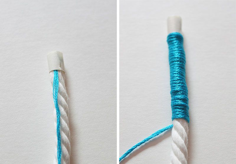 When you reach the end of the rope, tape the thread to the rope and cut off the excess thread. If you want to add a second color, tie a knot wherever you want that color to start. Wrap tightly around.