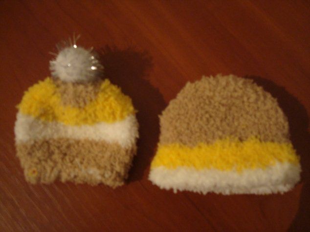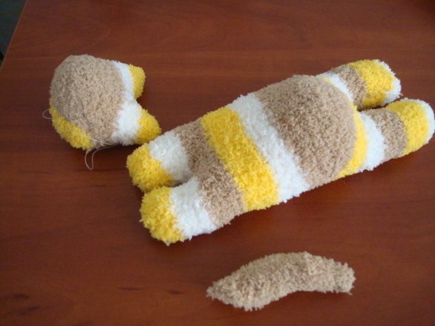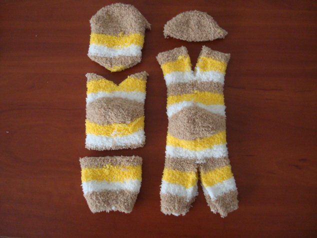 So, from the first sock with you should get two hats and cat muzzle. And from the second - the trunk and tail.