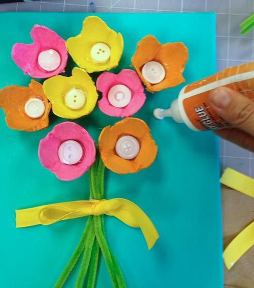 Glue buttons inside of each flower, and they don’t necessarily need to be similar.