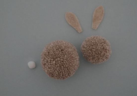 Step 5. Now you can assemble these parts together. Remove some yarn from places where two pom poms will be linked together. You can squeeze some glue on pom poms and to hold them until the glue takes hold. Fix the bunny’s ears the same way. Separate the yearn on pom pom, add some glue and hold the ears to set in place. Now you have to make eyes and tail for your bunny. Use beards for eyes and small piece of felt for tail.