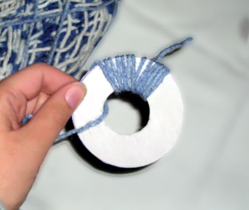 Step 2. Cut out the disks from cardboard and put them together. Now you have to reel up the yarn around the disk. Then you will need to cut the wool between the cardboard, at the outer edge of the disk. Now you have a ball of wool. Tie off the pom pom by pulling the string between the two cardboard disks and then tighten it around the centre. Then you can slide the two disks off. Tidy up your pom pom with scissors.