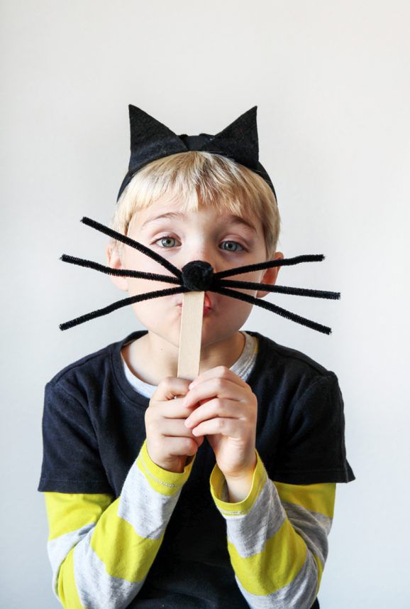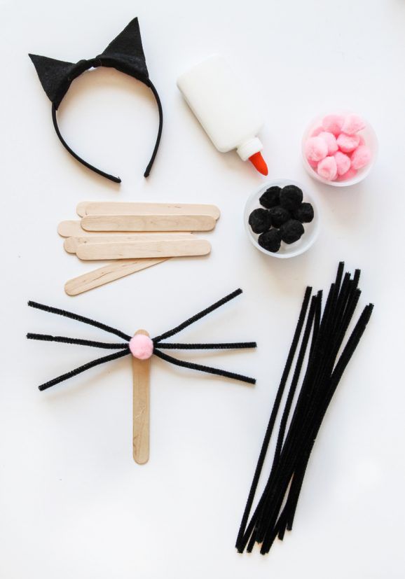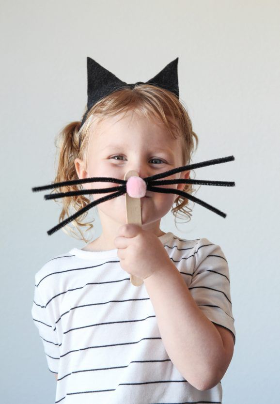 First cut black felt triangles to create cat ears. If you would like a tracing guide, check out free printable animal ear templates online. Glue the felt pieces around a black headband. Next, take three black pipe cleaners and twist them together in the center to create whiskers. Glue on a pom-pom nose right over the part where the pipe cleaners are twisted. Glue the whiskers to a popsicle stick or attach to clear elastic cording for a hands-free version.