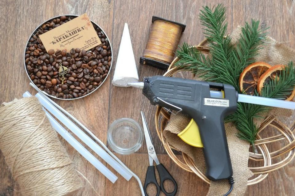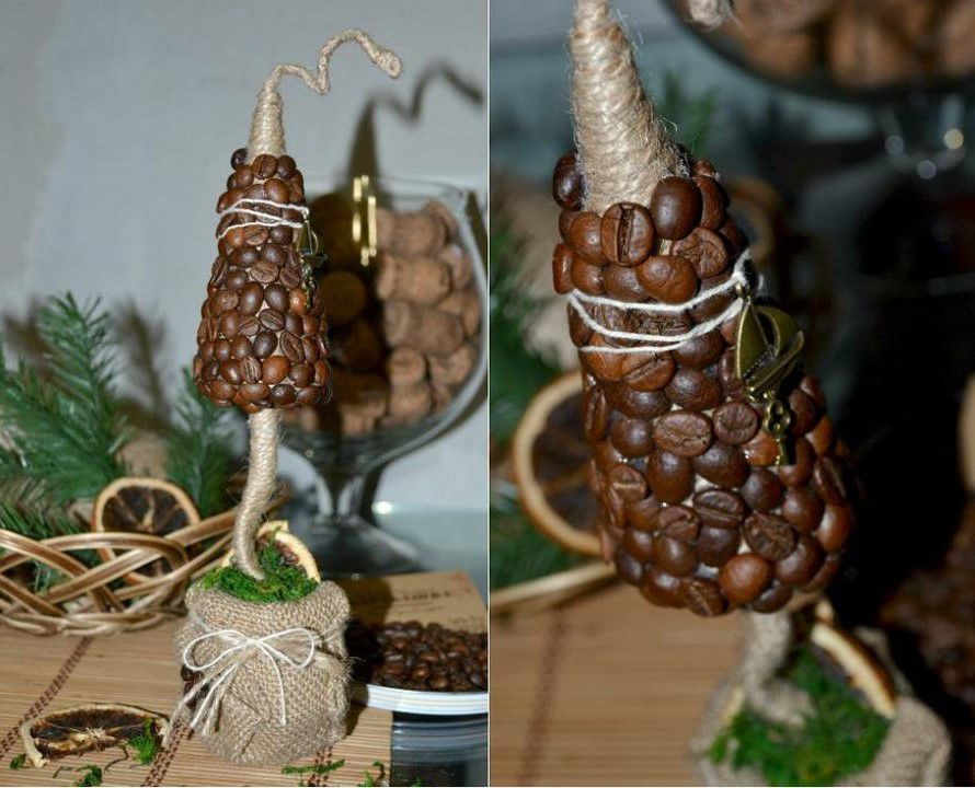 Fix the extra piece of the jute twine with glue . Wrap the trunk of the tree with the jute and glue the coffee beans to the bottom, starting with the sharp edge, covering the bottom and then gradually covering the whole tree.