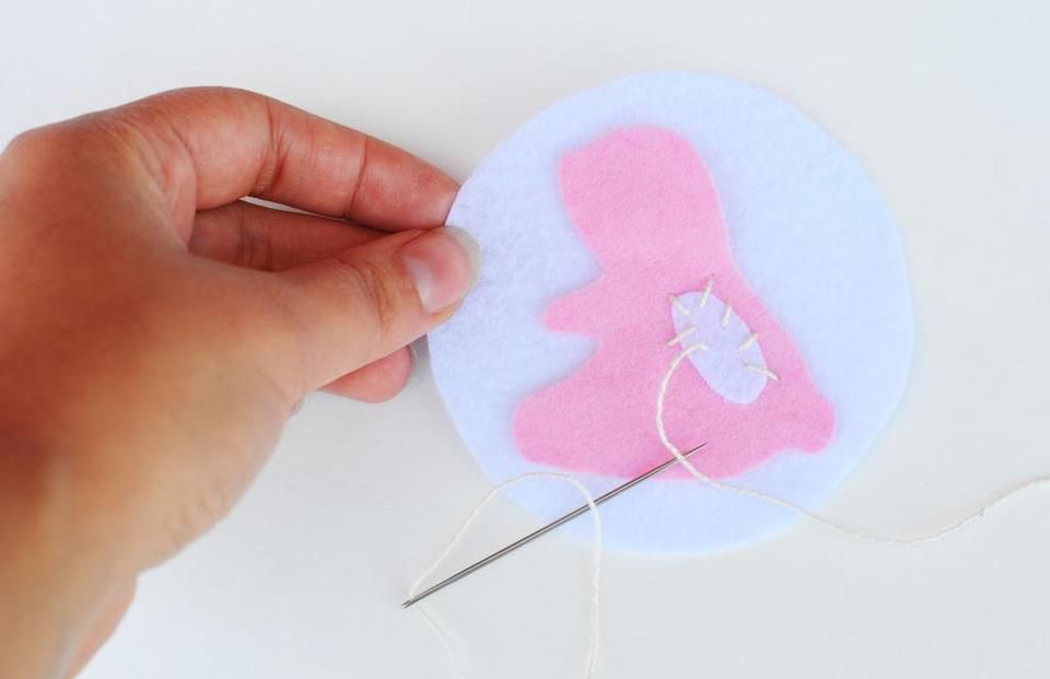 Think about what pictures you want to put together, in order to create an interesting color composition. Using the yarn, sew the details down step by step, starting from the bigger ones.