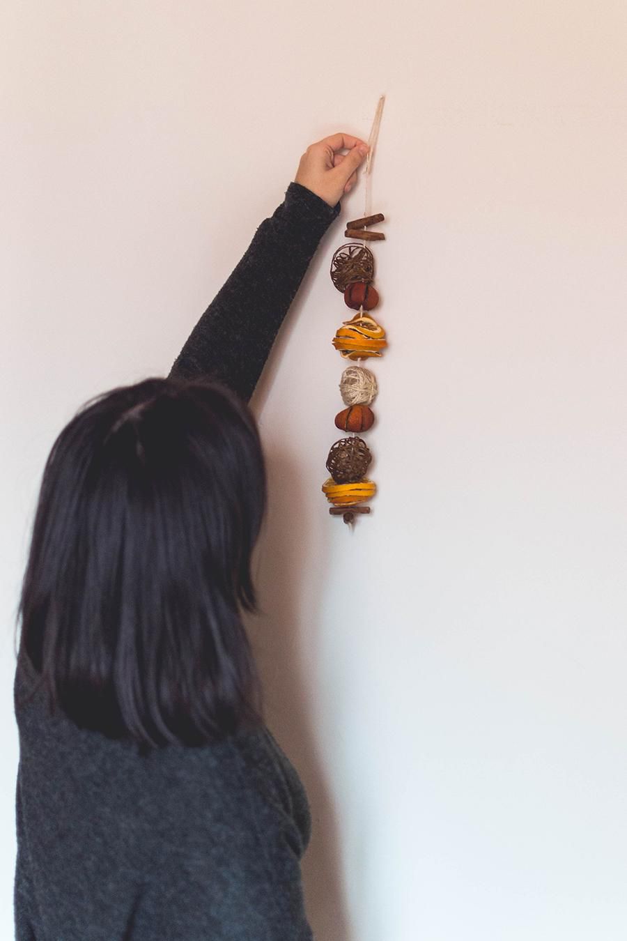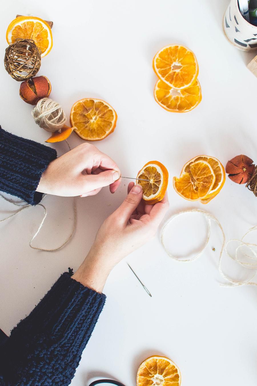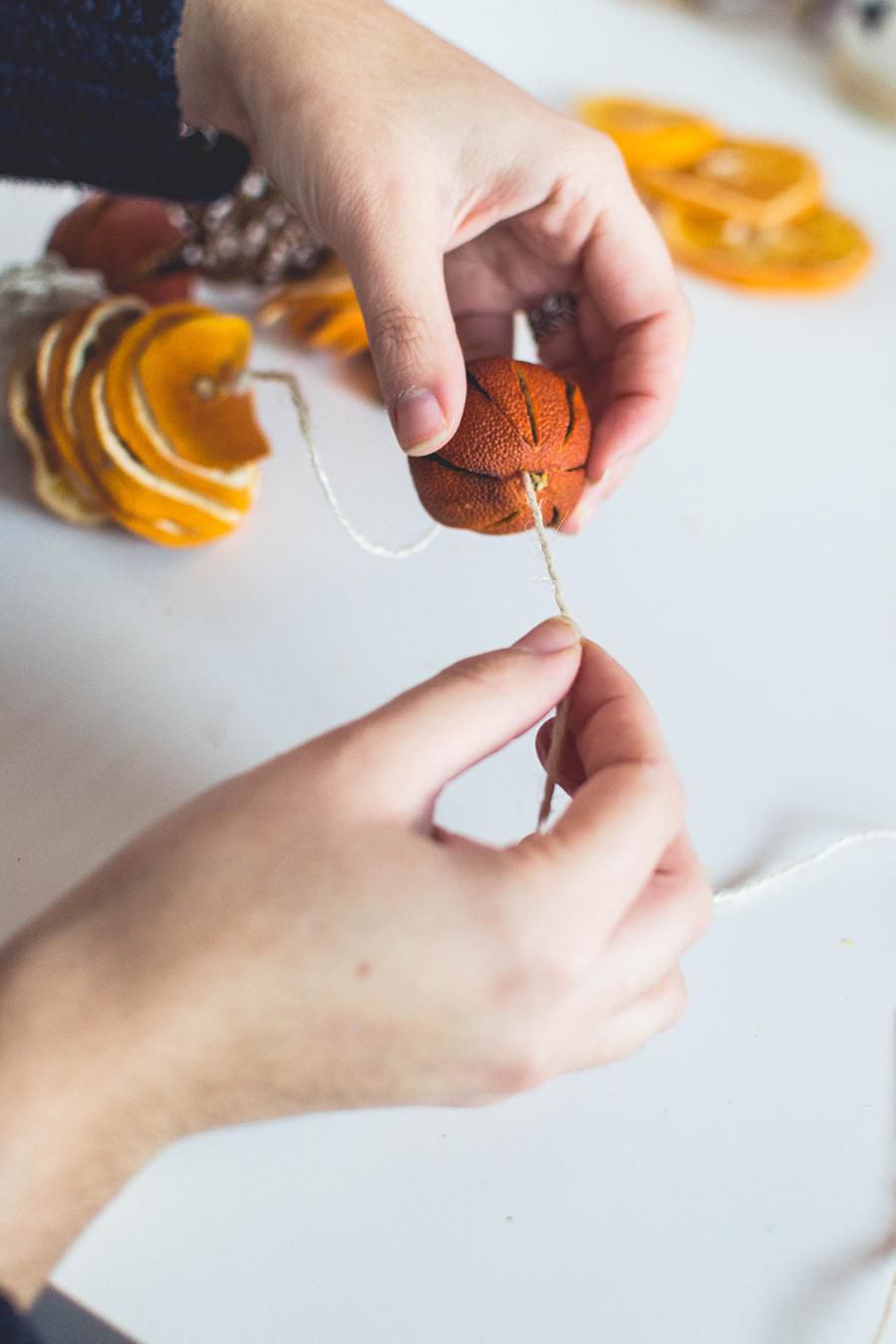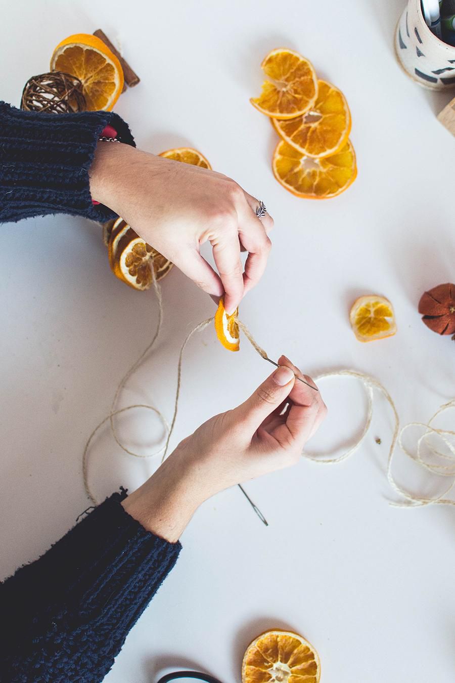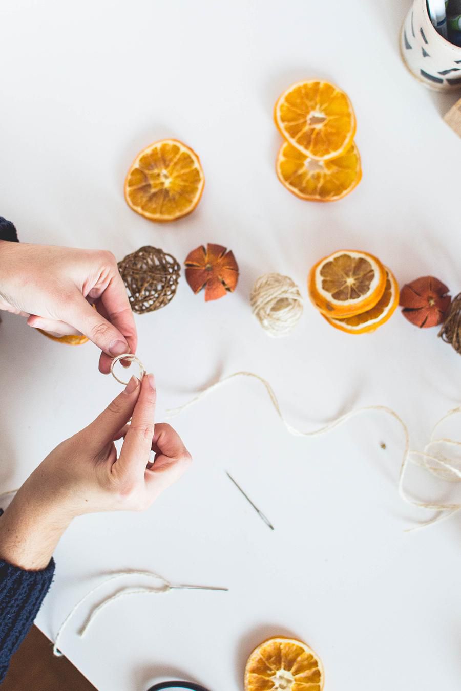 String twine balls, orange slices and cinnamon sticks on it and don’t forget to fix them with little knots on both sides.