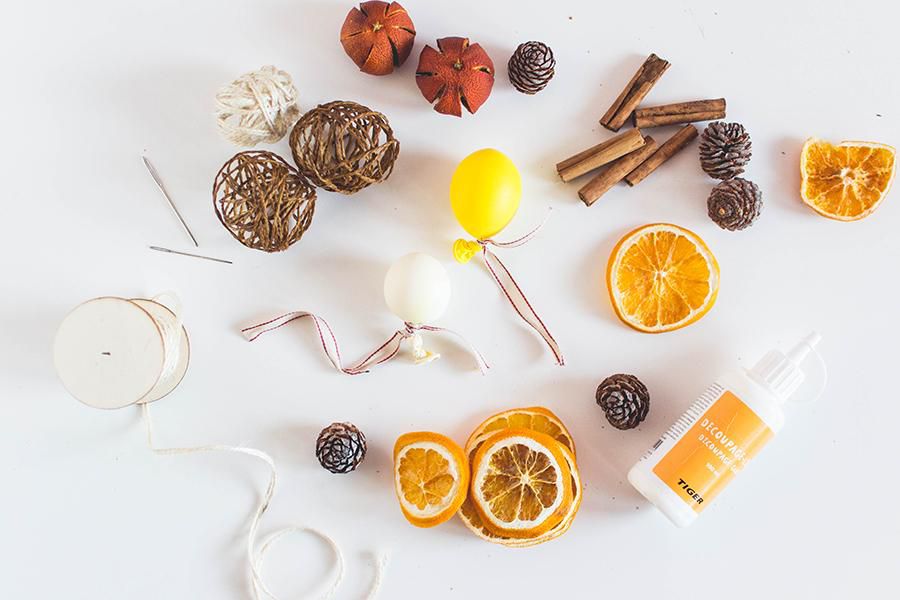 You can either to buy all the decorative balls made out of twigs or threads, or you can make them by yourself. For this you just need to mix a vinyl adhesive with water in the ratio 1: 1, adding a few drops of essential oil that you chose. Inflate the balloons to the approximate size of a small orange and then tie them on the tips.