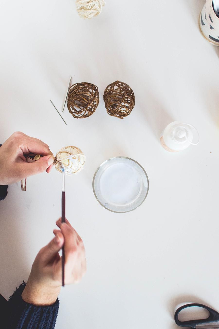 Begin wrapping the balloons with the twine and don’t leave any single area of its surface. Make it tight enough, but so that you can still see the balloon through the twine. When the ball is wrapped, take an old brush and start to carefully apply the adhesive on the twine.
