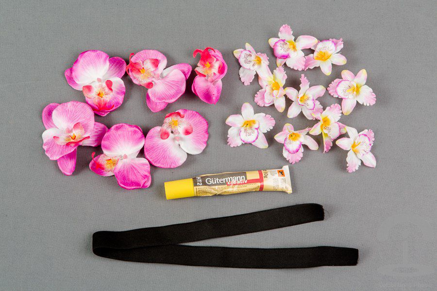 For the start sew or glue the flowers on the tape - do it as more densely as possible. And once you've covered the entire tape with flowers, sew the ends of the rubber band so that your wreath encircled the entire head.