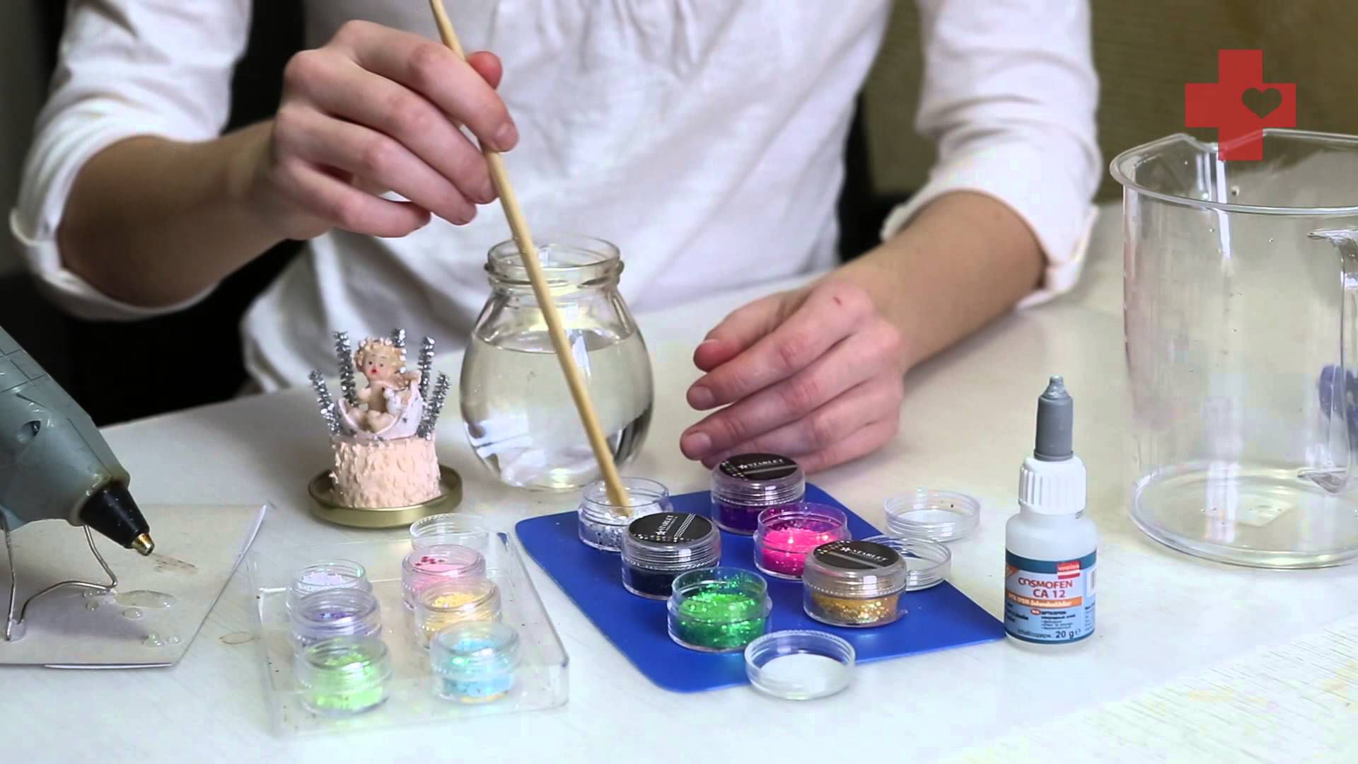 Then glue the decorations to the lid and let them dry.