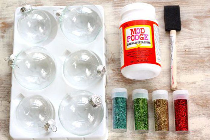 You need to pour glitter into the container, in which you will place the ball. Draw any ornament, pattern with thin lines on the ball with the help of glue. Now liberally sprinkle glitter on the ball, so that it densely sticks to the glue and doesn't leave any gaps. Next, you need to hang the ball in a place where it will not be tangent to anything. After it dries,using a brush, brush away the excess glitter, which hasn't stuck to the glue.